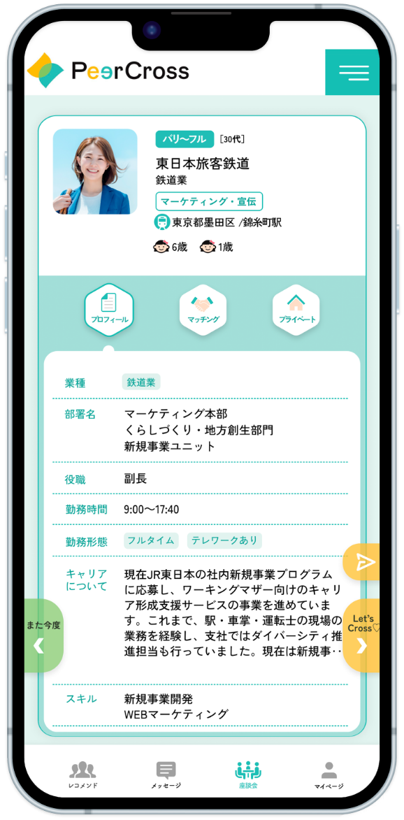 大手企業のワーキングマザー同士が、PeerCrossが定期的にレコメンドする候補の方から