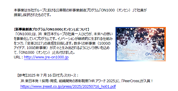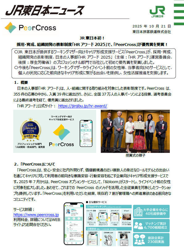 【プレスリリース】JR東日本初! 採用・育成、組織開発の表彰制度「HRアワード2025」で、「PeerCross」が優秀賞を受賞!