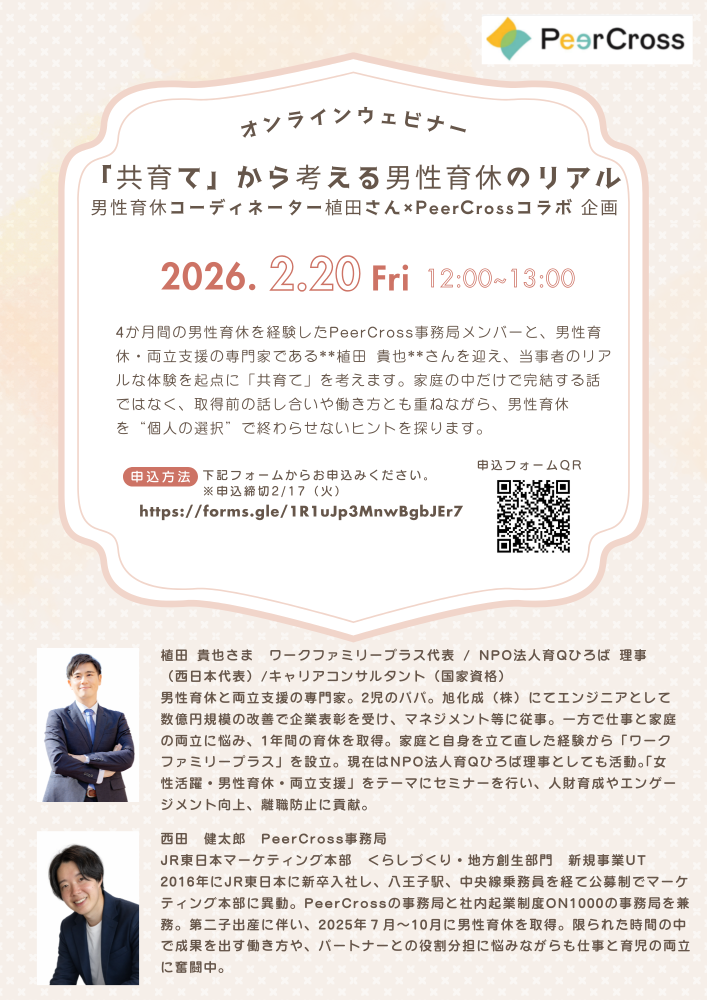 4か月間の男性育休を経験した PeerCross 事務局メンバーと、男性育休・両立支援の専門家である植田さんを迎え、当事者のリアルな体験を起点に「共育て」を考えます。
