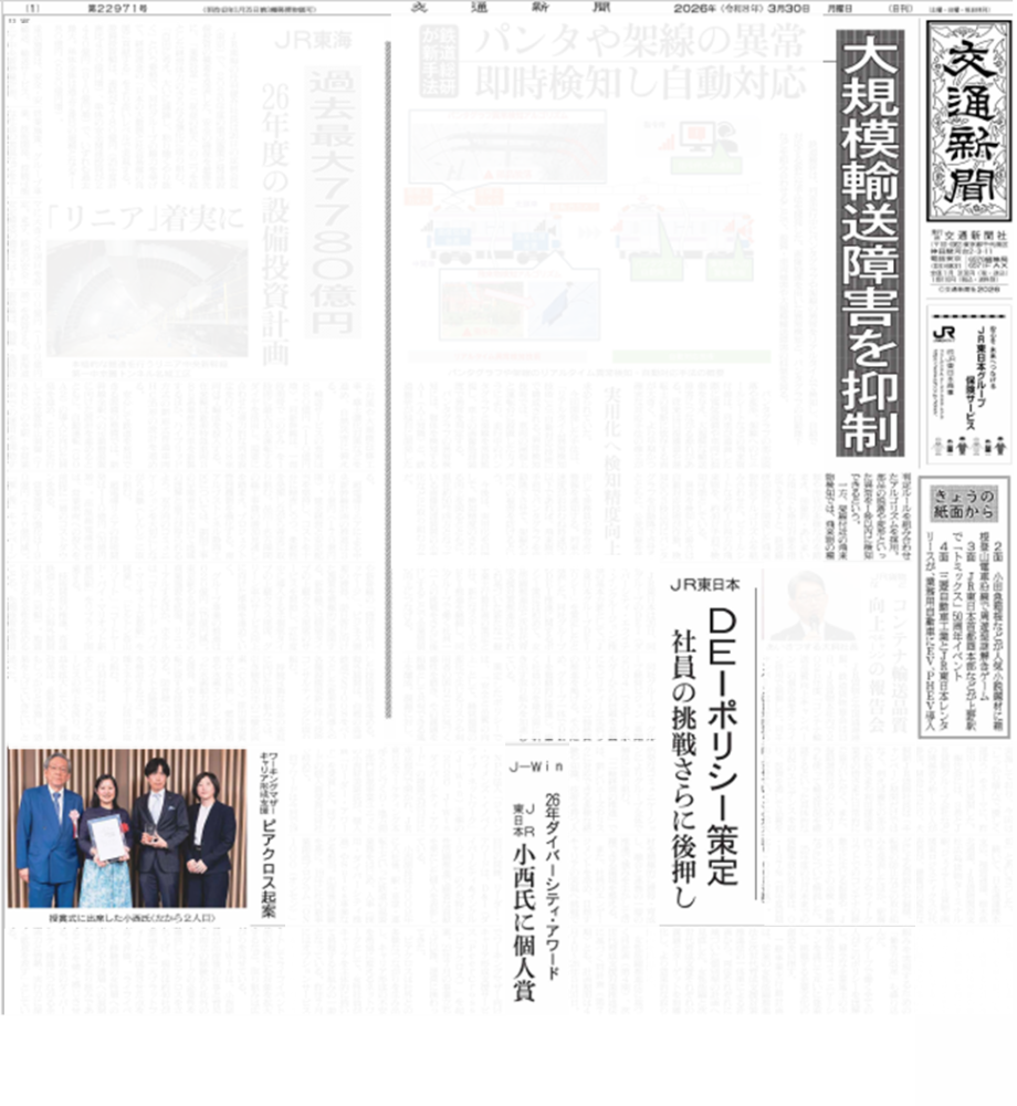 3月30日付交通新聞の一面に、PeerCross起案者の小西の「2026 J-Win ダイバーシティ・アワード」受賞について掲載されました!